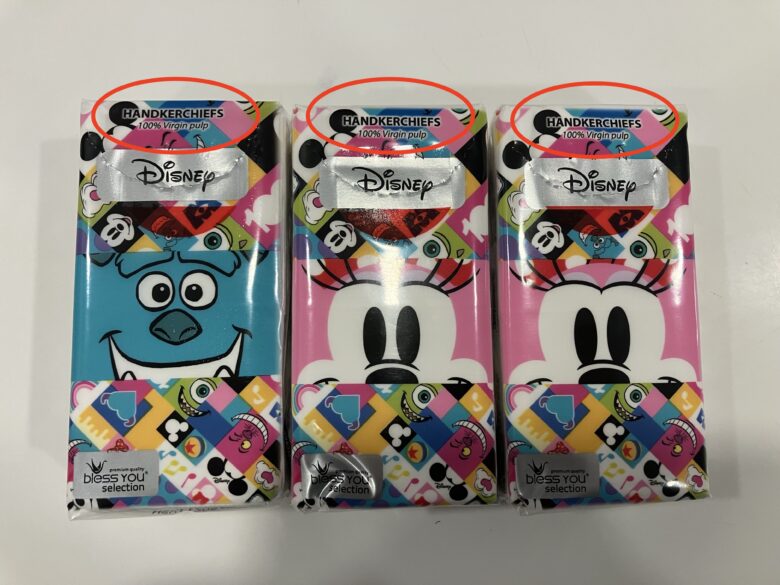 ▼スーパーにはポケットサイズの紙ナプキンはよく売っている(ハンカチって書いてある)