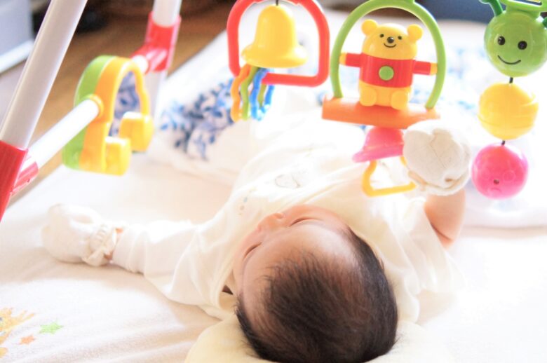 ねんね時期(寝返りがうてない頃)は遊べるおもちゃは限られますが、うちの子はにぎりやすい布のおもちゃがお気に入りでした。
