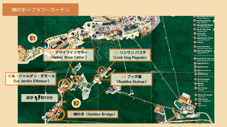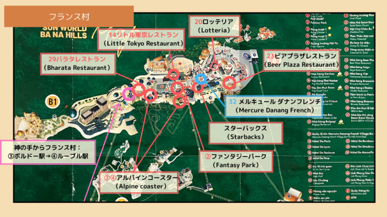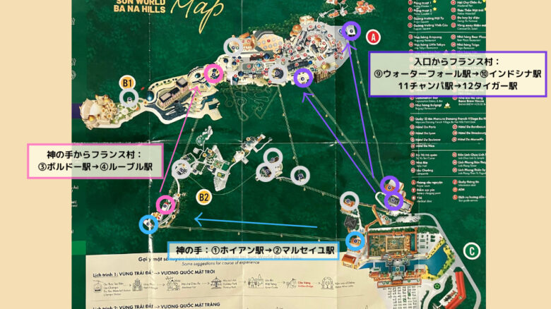 • 入口からフランス村:⑨ウォーターフォール駅→⑩インドシナ駅