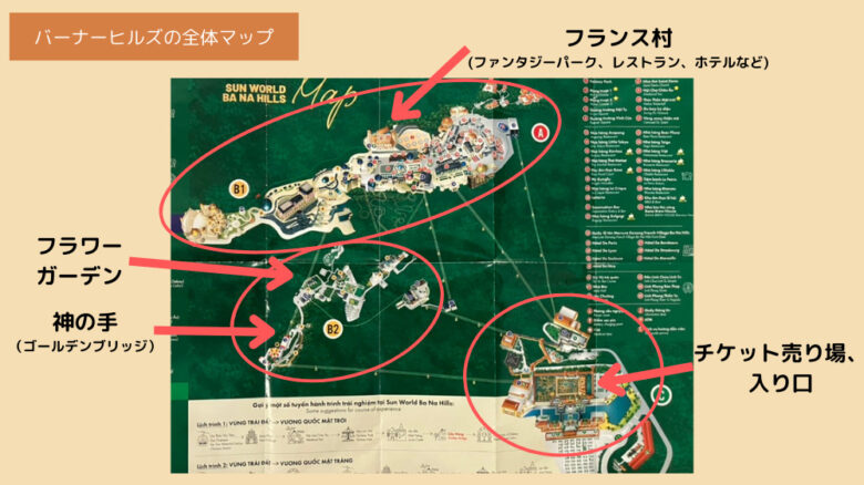 • 大きく分けると3つのエリア(①チケット売り場、②神の手、③フランス村)に分かれている