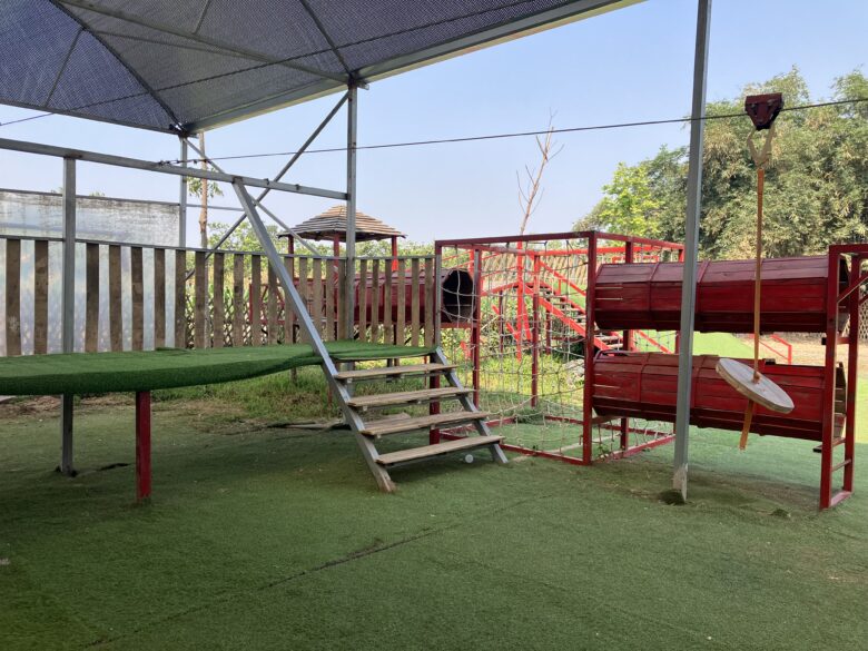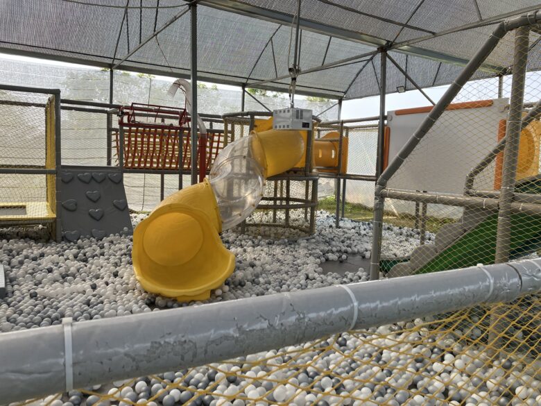▼子どもの遊び場は屋根付きなので日よけ&雨対策になっています。