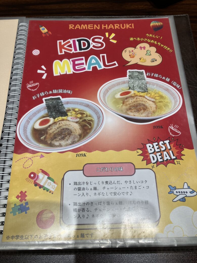 我が家行きつけ?のリンラン通りにあるらぁ麺春樹で醤油味と塩味の子ども用ラーメンがあります。