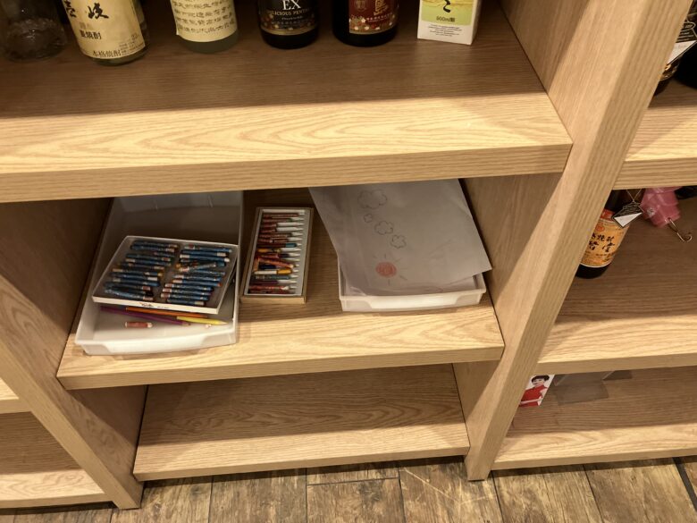 ホテルの2階にあるTHE DININGのレストランにもお絵描きセットや絵本があります!