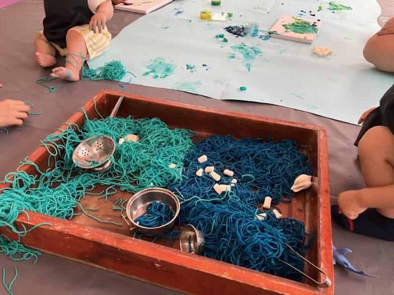 ▼色のついたスパゲッティとマシュマロで遊ぶ