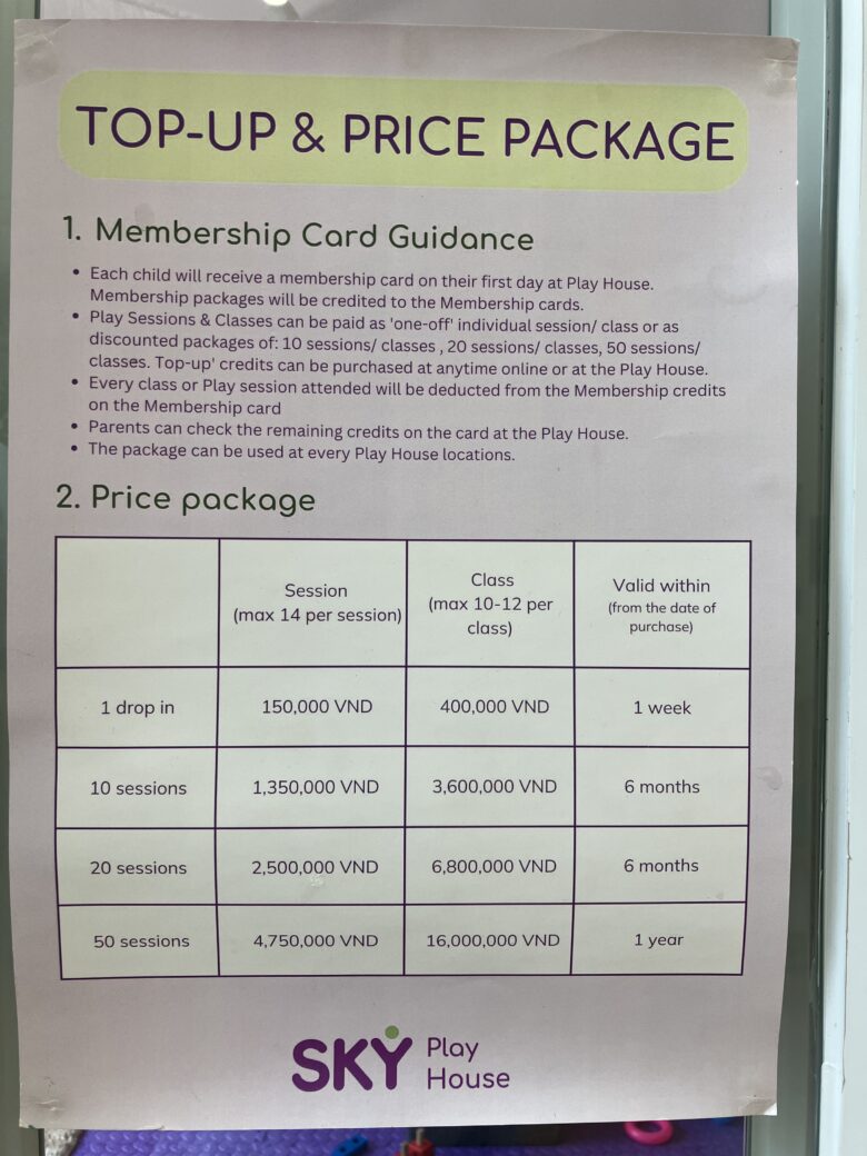 | class (クラス) | 音楽、アートなど日替わりで開催されるプレイグループ(45分)に参加。 別の部屋に移動して行われる。その後プレイハウスでも遊べる | 400,000VND程度 (≒2,000円) |